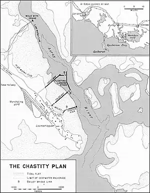 Other attractive features of Operation Chastity were the sheltered anchorage in Quiberon Bay, that the port required only a fraction of the labor and materials committed to the Mulberry ports, and that it used standard components and available equipment.[15]