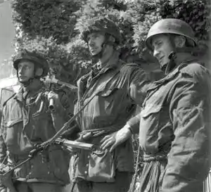 Howard was awarded the Distinguished Service Order, presented in the field by General Bernard Montgomery.[92] Both Smith and Sweeney were awarded the Military Cross;[93][94] the Military Medal was awarded to Sergeant Thornton[95] and Lance-Corporal Stacey;[96] Lieutenant Brotheridge was posthumously mentioned in dispatches.[97] In recognition of their feat of flying, eight of the glider pilots were awarded the Distinguished Flying Medal.[98]