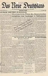 As other propaganda material was also to be distributed in this way - in which the obvious Allied origin could not be denied - a cunning trick was used to make the alleged German opposition magazine Das Neue Deutschland appear plausible. To do this, an additional imprint was placed on the front page of the journals that were being dropped, which was supposed to point to alleged chance finds during the advance of Allied forces. Thus, for example, the following text appeared on the front page: (in German) "During the occupation of Paris this German newspaper fell into the hands of the Allies". The success of this measure could also be seen in the fierce counter-reaction on the German side that followed later, for example, when Heinrich Himmler's own propaganda magazine Das Schwarze Korps drew attention to the magazine's traitorous authors. This led to devastating comments on the contents of the journal and on the authors themselves.