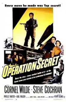 Operation Secret is a 1952 American drama film directed by Lewis Seiler and written by Harold Medford and James R. Webb. The film stars Cornel Wilde, Steve Cochran, Phyllis Thaxter, Karl Malden, Paul Picerni and Lester Matthews. The film was released by Warner Bros. on November 8, 1952.[1][2] The film is based on the exploits of US Marine Corps Major Peter Ortiz.[3]