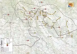 The HV and the HVO fielded Operational Group Rujani, a combined force controlled by the HV Split Corps under command of Lieutenant General Ante Gotovina. The Operational Group comprised approximately 8,500 troops arranged in two groups, and was directed against Bosansko Grahovo and Glamoč. The HVO troops were deployed against Glamoč and the HV force was arrayed in the Glamoč and Bosansko Grahovo areas.[57] The defending force consisted of approximately 5,500 troops drawn from the VRS 2nd Krajina Corps, commanded by Major General Radivoje Tomanić.[57] The 2nd Krajina Corps was supported by the Vijuga battlegroup put together by the RSK 7th North Dalmatian Corps and initially deployed to the Bosansko Grahovo area as a 500-strong unit in late 1994.[58] The area was additionally reinforced following the HV's Operation Leap 2 in June 1995, using three VRS brigades deployed to Bosansko Grahovo and Glamoč.[57] The VRS-deployed units were strengthened by platoons and companies transferred from seven brigades of the VRS 1st Krajina Corps and from three brigades of the VRS East Bosnian Corps.[59]