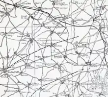 On the reverse slope of that ridge, Riegel II Stellung (Reserve Position II) ran from Ablainzevelle to west of Logeast Wood, west of Achiet-le-Grand, western outskirts of Bapaume, Rocquigny, Le Mesnil en Arrousaise to Vaux Wood.[1] Riegel III Stellung (Reserve Position III) branched from Riegel II at Achiet-le-Grand clockwise around Bapaume, then south to Beugny, Ytres, Nurlu and Templeux-la-Fosse.[1] The first two lines were also known as the Allainesstellung and Arminstellung by the Germans and had various British titles (Loupart Line, Bapaume Line, Transloy Line and Bihucourt Line, the third line was known as the Beugny–Ytres Switch. [2] The 1st Army held the Somme front from the River Somme north to Gommecourt and had a similar number of troops to the British opposite, with ten divisions in reserve.[2][lower-alpha 1] On the night of 1/2 January, a German attack captured Hope Post near the Beaumont Hamel–Serre road, before being lost with another post on the night of 5/6 January.[3]