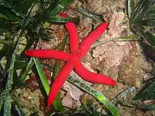 Ophidiaster ophidianus, the purple starfish, is a species of starfish from the East Atlantic (from mainland Portugal and the Azores down to the Gulf of Guinea) and the Mediterranean Sea.[2][3] It has a big variation in colour (from red to orange) and may present brown spots.[4][5] The central disc is small, covered by irregular plates,[6] and the arms are thinner near the central disc. Each arm has lines of respiratory papillae.[7] It can reach 40 cm in diameter.[7]