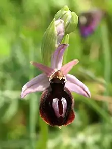 Ophrys ferrum-equinum, the horseshoe bee-orchid, is a terrestrial species of orchid native to Albania, Greece, and Turkey, including Crete and other islands of the Aegean.[1] It owes its species name to the characteristic shape of a silver horse-shoe on the brown petal.