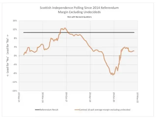Throughout the period, significant events have caused polls to swing sharply. For example the result of the Brexit referendum and the election of Boris Johnson as the UK Prime minister caused sentiment to temporarily move in favour of 'Yes', only to soon move back towards the status quo ante.