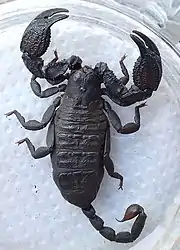 Opisthacanthus capensis is a Cape Province and Zimbabwean species of scorpion with robust chelae, dark brown to black in colour, turning green when under cover for some time. Opisthacanthus scorpions are arboreal and ground-dwelling, and found mainly in moist habitats in dense vegetation, pine plantations and forests, and hiding under bark and rocks.[2]
