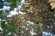 They are reported to share their evolutionary closest correlates with the genera Buckinghamia, Finschia, Grevillea and Hakea in the subtribe Hakeinae.[4][5][6] The genetics studies, still at an early stage, suggest Opisthiolepis may represent the continuing living lineage of the ancient branch off from near the base or from before the base of the entire present day subtribe Hakeinae.[4][6][7]