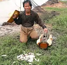 In 1965, 9 fish hosts of O. viverrini were known.[16] Up to 2002, 15 species of fishes from seven genera of the family Cyprinidae were known to serve as second intermediate host.[1] Further research by Rim et al. (2008) showed an additional five host species. The known hosts include Puntius brevis, P. gonionotus, P. orphoides, P. proctozysron, P. viehoeveri, Hampala dispar, H. macrolepidota, Cyclocheilichthys armatus, C. repasson, Labiobarbus lineatus, Esomus metallicus, Mystacoleucus marginatus, Puntioplites falcifer, Onychostoma elongatum, Osteochilus hasseltii, Hypsibarbus lagleri, and Barbodes gonionotus.[18]