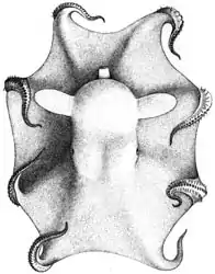 Fins curl around the mantle of the octopus and aid in swimming and balance, supported by cartilage. A study in a sister species, Opisthoteuthis grimaldii, observed them using the fins to maintain a vertical position in the water relative to the mantle and sea floor.[9] They have eight arms lined with a single line of suckers. Like other octopuses, they use their arms to move about, and their suckers aid in gripping rocks or other objects along their path. Most specimens have been observed having 58-80 suckers per arm.[10] O. agassizii do not have mechanoreceptors lining their suckers like non-cirrate octopuses, nor do they have cilia; instead there are microvilli structures that appear to be used for olfaction. There are two eyes visible within the mantle, but the optic system is much reduced compared to other species within the order Otcopoda.[8] They have a very small shell, like most octopuses do, and have cirri along the undersides of their tentacles.