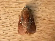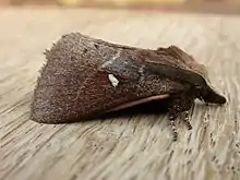 The wingspan is about 40 mm for males and 50 mm for females. Adults are grey with a white spot and two black-edged white lines on each forewing. The hindwings are brown.[2]