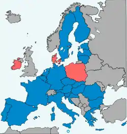 Although not a full opt-out, both Poland and former member state the United Kingdom secured a protocol which clarified how the Charter of Fundamental Rights of the European Union, a part of the Treaty of Lisbon, would interact with national law in their countries limiting the extent that European courts would be able to rule on issues related to the Charter if they are brought to courts in Poland or the UK.[18] Poland's then ruling party, Law and Justice, mainly noted concerns that it might force Poland to grant homosexual couples the same kind of benefits which heterosexual couples enjoy,[19] while the UK was worried that the Charter might be used to alter British labour law, especially as relates to allowing more strikes.[20] The European Scrutiny Committee of the British House of Commons, including members of both the Labour Party and the Conservative Party, cast doubts on the protocol's text, asserting that the clarification might not have been worded strongly and clearly enough to achieve the government's aims.[21][22][23] The UK ultimately withdrew from the European Union in 2020, leaving Poland as the only state with the opt-out.