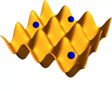 Atoms trapped in the optical lattice may move due to quantum tunneling, even if the potential well depth of the lattice points exceeds the kinetic energy of the atoms, which is similar to the electrons in a conductor.[3] However, a superfluid–Mott insulator transition[4] may occur, if the interaction energy between the atoms becomes larger than the hopping energy when the well depth is very large. In the Mott insulator phase, atoms will be trapped in the potential minima and cannot move freely, which is similar to the electrons in an insulator. In the case of Fermionic atoms, if the well depth is further increased the atoms are predicted to form an antiferromagnetic, i.e. Néel state at sufficiently low temperatures.[5]