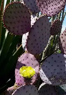 Like most prickly pears, the pads are flat. Unlike most prickly pears, they have a violet, pink, or red tinge, hence the name. The cactus reaches mature heights of one to five feet and blooms either yellow or red.