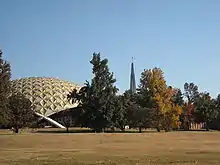 The campus began construction in 1963 with a futuristic look and architecture, which historian Margaret Grubiak noted as being inspired by the 1933 Chicago World's Fair.[71] Architects Stanfield, Imel & Walton of Tulsa designed the 1963 master plan, but most of the buildings were designed by Tulsa architect Frank Wallace.[72] In 1981, the City of Faith Medical and Research Center opened. The buildings were south of the ORU campus, and were originally built as a 60-story clinic, a 30-story hospital, and a 20-story research center. The original tenants left in 1989 because of financial problems and a lack of demand for medical services. As of 2007, some floors (in the 20-story building) have never been leased. The facility is now mostly leased out as commercial office space under the name CityPlex Towers. A 60 ft (18.2 m), 30 ton bronze sculpture Healing Hands, by sculptor Leonard McMurray (cast in Ciudad Juárez, Mexico in 1980) and originally in front of the towers, was moved to the ORU campus entrance in the summer of 1991.[73] By 2007, the campus was described as "a perfect representation of the popular modernistic architecture of the time... the set of The Jetsons" but also "shabby" and "dated, like Disney's Tomorrowland."[35][74][75] Interviewed in 2010, Wallace characterized his ORU buildings as "sculptures", noting that an inspiration for his artistic sensibility was "whittling since I was a kid".[76] It has also been suggested that the buildings may have been inspired by Tulsa's art deco architectural heritage,[77][78] along with Bruce Goff's individualistic style and creative use of new materials.[79]