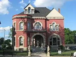 The Nincehelser House is a large residence built primarily in the Queen Anne style,[6]: 8 but it includes other stylistic elements, such as a main entrance recessed from the facade, stained glass windows, and a Palladian window.[6]: 2 Built of brick with assorted stone elements, the house rests on a stone foundation and is covered with a slate roof.[7] Uniformity is absent from the design; the primarily hipped roof of the two-and-a-half-story residence comprises multiple components, the overall floor plan is asymmetrical, and the windows are of diverse shapes and sizes.[5]
