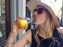 His son, Jean-Claude Beton, took over the company from his father in 1947.[7][8] Jean-Claude Beton kept most of the original recipe, which he marketed to appeal to European and North African consumers.[7] Orangina quickly became a common beverage throughout North Africa.[8] In 1951, Jean-Claude Beton introduced Orangina's signature 8-ounce bottle, which became a symbol of the brand.[7] The bottle recalls the rounded shape of an orange, with a glass texture designed to mimic the fruit.[7]