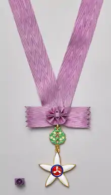 The badge of the order, which is in gold with white enamel, is in the form of a Tachibana orange blossom; the central disc bears three crescent-shaped jades (magatama). The badge is suspended on a gold and enamel wreath of mandarin orange leaves and fruit, which is in turn suspended on a purple ribbon worn around the neck.