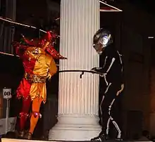 The Order of Myths, founded in 1867,[1] is the oldest mystic society to celebrate Mardi Gras in Mobile, Alabama. The Order of Myths chose, as its symbolic emblem, Folly chasing Death around a broken column of life. During parades, a person dressed in a jester's suit, as Folly, chases a person dressed in a skeleton suit as Death, around a Greek column on the emblem float. At the conclusion of the traditional OOM parade, Death is defeated, and Folly wins the day.[1]