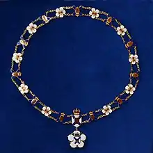Upon admission into the Order of Nova Scotia, usually in a ceremony held at Government House in Halifax, new Members are presented with the order's insignia. The main badge consists of a gold medallion in the form of a stylized epigaea repens (or mayflower)—the official provincial flower—with the obverse in white enamel with gold edging, and bearing at its centre the escutcheon of the arms of Nova Scotia, all surmounted by a St. Edward's Crown symbolizing the Canadian monarch's role as the fount of honour.[10] The ribbon is patterned with vertical stripes in red, blue, gold, and white; men wear the medallion suspended from this ribbon at the collar, while women carry theirs on a ribbon bow at the left chest. Members also receive a lapel pin that can be worn during less formal occasions.[4]