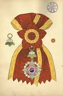 Order of the Plum Blossom was the part of the establishment of orders in 1900 by Gojong of Korea. Gojong said that the order of the Plum Blossom was given to those who already got the first class of Order of the Taegeuk and has special merit after receiving Order of the Taeguk. Only the Emperor can decide the recipient of Order of the Plum Blossom.[1] It was named after flower Ehwa which was the national flower of the Korean Empire. There were 62 recipients of Order of the Plum Blossom.