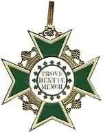 The star of the order is made of silver, and has eight points. The center of the star bears a gold medallion with the motto of the order, PROVIDENTIÆ MEMOR, inside a ring of green rue leaves.