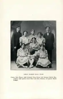 It would not be until the 1901–02 season that a formal men's basketball program would be established at the school.[7] The women's basketball program continued to set the pace for the school, with the team going unbeaten into March and generating a $50 gate for the athletic fund for a single game against Chemawa.[8] "The example they set OAC young men in athletics is worthy of emulation," the Corvallis Times opined.[8]