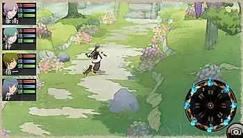 Character development is based on leveling up through gaining experience and equipping various equipment akin to most role-playing games. Characters are able to develop abilities known as "arts" and "secret techniques", and the party consists of a leader and three other members. Whilst in dungeons, players fight demons and acquire items. Dungeons vary from caves, forests, mansions and temples.[11] There is a "Symbol Encounter" system for initiating battles, similar to recent Japanese RPG games, where a battle advantage can be attained by approaching enemies from the rear.[14] The game progresses as the player takes control over a family faction that spans the nation, and expands the control of the family. The family is managed by the player at a central base in the form of a mansion, whilst nearby towns have various stores that can be utilised.[11]