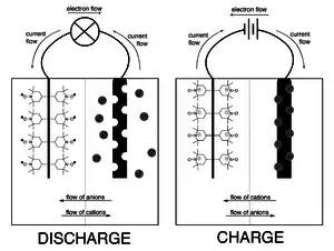 Much like a traditional battery such as a Li-ion battery, an organic radical battery consists of a cathode and an anode that are separated by a porous film and submerged in an electrolyte. In a pure organic radical battery, both terminals are made of organic radical polymers (a p-type and an n-type polymer), while a metal/ORB hybrid battery usually has a radical polymer cathode and a Li-ion/graphite anode.[8]