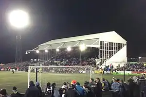 Oriel Park has an all-weather pitch, the current pitch being laid in 2017.[5] There are two covered stands in the ground, one on either side of the pitch. The main stand on the Carrick Road side of the ground contains the dressing rooms and the club bars, offices and club shop. The ‘Shed’, on the opposite side, houses the ground’s commentary box and principle camera position. The Shed fronts the club’s Youth Development Centre (YDC), which was built in 2010.[6] There is uncovered seated terracing on either side of the main stand and standing room behind the eastern goal (the 'Town End'). There is an access road to the YDC behind the western goal (the 'Carrick End').