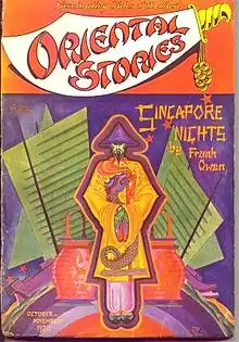 In 1923, J.C Henneberger and J.M. Lansinger's Rural Publishing Corporation launched Weird Tales, as a companion to their existing magazines, College Humor, The Magazine of Fun, and Detective Tales.[1] Weird Tales soon ran into financial trouble, and in late 1924 Henneberger and Lansinger split control of their stable of magazines: Henneberger incorporated Popular Fiction Co., took Weird Tales, and gave up the other titles, hiring Farnsworth Wright as editor.[2][3] Wright liked adventure and fantasy fiction with oriental settings, and printed some in Weird Tales, by writers such as Frank Owen.[4] In 1930 Henneberger and Wright decided to launch a companion magazine that specialized in oriental fiction.[2][3] The plans were in place by June 1930, when Wright wrote to Robert E. Howard, telling him about the new magazine, and asking him to submit stories.[5] Howard complied, and his "The Voice of El-Lil", about a lost city in Mesopotamia, appeared in the first issue, along with two stories by Frank Owen, and "The Man Who Limped" by Otis Adelbert Kline, the first in a series about a dragoman (interpreter) named Hamad the Attar. Other contributors included E. Hoffman Price, Frank Belknap Long, August Derleth, and David H. Keller; these were all known for fantasy, but Oriental Stories also published work by writers of non-fantasy adventures, including S.B.H. Hurst, James W. Bennett, and Warren Hastings. Frank Owen followed his story in the first issue with seven more over the next three years, including "Della Wu, Chinese Courtesan", in the third issue, described by magazine historian Mike Ashley as one of his best-known tales.[6]
