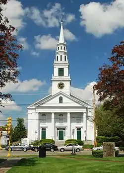 The Original Congregational Church of Wrentham is a historic church in Wrentham, Massachusetts. The present church is a Greek Revival structure built in 1834 for a congregation (Wrentham's first) formed in 1692. The church, which occupies a prominent position in the center of Wrentham, has a four-stage tower (rebuilt after the New England Hurricane of 1938), and a tetrastyle Doric portico. The building underwent a modernizing renovation in 1878, at which time many of the windows were modified to have rounded tops; many of these changes were reversed during renovations in the 1950s.[2]