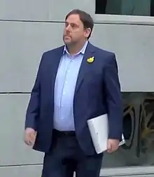 Oriol Junqueras i Vies (Catalan pronunciation: [uɾiˈɔl ʒuŋˈkeɾəz i ˈβi.əs]; born 11 April 1969) is a Spanish politician and historian from Catalonia.[3] A former mayor of the municipality of Sant Vicenç dels Horts in north-eastern Spain, Junqueras served as Vice President of Catalonia from January 2016 to October 2017 when he was removed from office following the Catalan declaration of independence and entered prison until June 2021, for his role in organizing the 2017 Catalan independence referendum.[4] He is president of the Republican Left of Catalonia (ERC).[5] Born in 1969 in Barcelona, Junqueras grew up in the municipality of Sant Vicenç dels Horts. After graduating from the Autonomous University of Barcelona, he taught history at the university.[6]