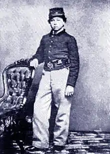 A drummer boy, 14 years of age, and severely wounded and exposed to a heavy fire from the enemy, he persistently remained upon the field of battle until he had reported to Gen. W. T. Sherman the necessity of supplying cartridges for the use of troops under command of Colonel Malmborg.[9]