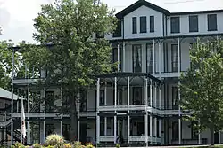 Orkney Springs Hotel is a historic resort spa complex located at Orkney Springs, Shenandoah County, Virginia. The oldest building, known as Maryland House, was built in 1853, and is a two-story, rectangular stuccoed frame building. It is faced on all sides by double galleries. The main hotel building, known as Virginia House, was built between 1873 and 1876. It is a four-story, stuccoed frame, "H"-shaped building measuring 100 feet by 165 feet and features a three-story verandah. The hotel contains 175 bedrooms . The remaining contributing resources are the three-story Pennsylvania House (1867), seven identical two-story, six-room, hipped roof cottages, and a small columned pavilion located next to the mineral springs.[3]