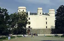 Orlík was established as a royal castle beside a ford across the River Vltava in the second half of the 13th century, probably by Přemysl Otakar II, although in the Middle Ages it came into the hands of noble families and its ownership changed many times. From 1408 the Zmrzlík of Svojšín family owned it, and during their time the Hussite Captain Jan Žižka of Trocnov stayed in the castle.[5] In 1508 the castle burned down, and was rebuilt as a Renaissance chateâu by the new owners, the Lords of Švamberk. In 1623 the Eggenbergs acquired Orlík, and in 1717 it was inherited by the Schwarzenbergs.[6] At the beginning of the 19th century it became their main residence. In 1802 the chateâu was burned out, and during the subsequent repairs a fourth storey was added to the building. The most famous member of the family was Field Marshal Karl Philipp, Prince of Schwarzenberg, who was victorious over Napoleon in the Battle of Leipzig in 1813. The current Romantic Gothic appearance dates from 1849 to 1860, when partial remodelling in this style was carried out according to plans by Bernard Gruber. The Early Gothic style castle of Orlík was confiscated by the Communist Regime after 1948, but in 1990s was reverted to the Schwarzenbergs.
