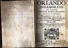 The first two books were published sometime between 1482 and 1483, most likely by Pietro Giovanni di San Lorenzo in Reggio; but all copies were lost.[1] It most likely bore the title L'innamoramento de Orlando. The third book first appeared in 1495 (Venice: Simone Bevilacqua) under the title El fin del inamoramento de' Orlando. The first complete edition was published later in 1495 (Scandiano: Camillo Boiardo). Like the editio princeps (first two books), the first complete edition of 1495 has been completely lost. The oldest copy which came down to us is the 1487 reedition of the first two books (Venice: Pietro de' Piasi); only one copy exists, kept at the Biblioteca Marciana. There is also only one extant copy of the 1495 Venetian edition of the third book, located in Monaco. The oldest complete edition we have is dated 1506 (Venice: Giorgio de' Rusconi); there also remains only one copy, kept at the Marciana.[2]