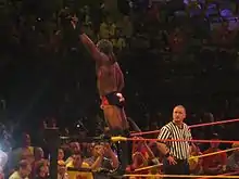 After JBL began a feud with John Cena over the WWE Championship leading up to WrestleMania 21, Jordan faced off with Cena on the March 3 edition of SmackDown!. Jordan defeated Cena with the help of JBL to win the United States Championship, his first and only title in WWE.[18] In a dark match before WrestleMania 21, Jordan competed in a 30-man battle royal, won by Booker T.[19] His first major successful title defense was against Heidenreich at Judgment Day.[20] At The Great American Bash, Jordan began feuding with the newly drafted Chris Benoit. Jordan defeated Benoit and retained his United States Championship after removing the turnbuckle pad and shoving Benoit head-first into the exposed steel and covered him for the win.[21] Benoit continued to chase Jordan for the title. He finally defeated Jordan (in a record 25.5 seconds) at SummerSlam to win the title.[22] Following this quick match, Jordan attempted to win the United States Championship back on multiple occasions, leading to 3 consecutive losses with all matches lasting less than a minute. The first rematch lasted 23.4 seconds.[23] During the second rematch, Jordan actually almost knocked out Benoit with a punch in the opening moments but still lost at 22.5 seconds, which was even faster than the first match.[24] During the third match, Jordan stalled until the time, which was being displayed on the TitanTron, went over 25 seconds.[25] He got so excited when his time went over 30 seconds that he dropped his guard and Benoit took the opportunity to lock on the Crippler Crossface for a win at the 49.8 second mark.[25] On the October 14 edition of SmackDown!, Jordan stated that he mastered every counter to Benoit's signature Crippler Crossface. Jordan also stated, if he tapped out to the Crippler Crossface, Jordan would quit this business. Jordan lived up to his words by countering every Crippler Crossface attempt by Benoit. The match ultimately ended after Jordan tapped out to Benoit's Sharpshooter. After those unsuccessful rematches, Jordan later broke away from JBL, although both later made a few appearances together later on.