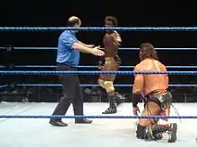 When Booker T got injured halfway through his Best of Seven series for the United States Championship, he needed a replacement to face Chris Benoit.[26] As the series was at 3–1 in Booker's favor, Booker T only needed his replacement to win one match in order to become the United States Champion.[26] Jordan approached him about the position, but Booker T and his wife Sharmell belittled him and made jokes about his quick submission losses to Benoit.[26] Booker asked Randy Orton to substitute for him.[26] After Orton failed to win the deciding match, leading Jordan to once again ask for the position the next week,[26][27] Booker T once again turned Jordan down after belittling him.[27] During the sixth match in the series, Jordan jumped the rail, grabbed Booker T's crutch, and hit Benoit for a disqualification finish and thus giving Benoit the victory and tying the Best of Seven Series at 3–3.[27] The next week, Jordan ran to ringside to attempt to halt Booker T from winning the championship, but was unable to prevent Orton from eventually beating Benoit to win the series for Booker T. On the January 20 episode of SmackDown!, Jordan faced and lost to Randy Orton after Booker's wife Sharmell distracted the SmackDown! senior official referee Nick Patrick, before Booker hit him with a leg crutch. After the match, Chris Benoit saved him from Booker and Orton, turning him face for the first time since 2004.
