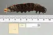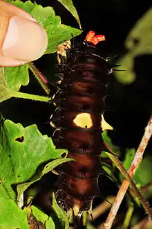 The egg is 4 mm. in diameter and light orange. Eggs are laid singly and are attached to the ventral surface of an Aristolochia leaf or a nearby object. The first instar larva is dark red wine colour. Instars 2-5 are velvet black and bear red tubercles with long black tips. The pupa is brown with a bright yellow and orange saddlemark. It has a waxy coating and two short, sharp spurs on abdominal segments 3-6.