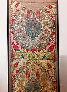 An orphrey, also spelt orfrey or orfray, is a form of often highly detailed embroidery, in which typically simple materials are made into complex patterns.[1] Orphreys are broad bands used on priests' albs and knights' robes. In 1182 and 1183 Henry II of England spent lavishly on orphreys.[1] The word comes from Old French orfreis, from Late Latin auriphrygium, from Latin aurum "gold" and Phrygius "Phrygian," as the Phrygians were known for their needlework with gold and silver threads.[2]