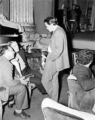 In 1937, Welles rehearsed Marc Blitzstein's political operetta, The Cradle Will Rock.[46] It was originally scheduled to open June 16, 1937, in its first public preview. Because of severe federal cutbacks in the Works Progress projects, the show's premiere at the Maxine Elliott Theatre was canceled. The theater was locked and guarded to prevent any government-purchased materials from being used for a commercial production of the work. In a last-minute move, Welles announced to waiting ticket-holders that the show was being transferred to the Venice, 20 blocks away. Some cast, and some crew and audience, walked the distance on foot. The union musicians refused to perform in a commercial theater for lower non-union government wages. The actors' union stated that the production belonged to the Federal Theatre Project and could not be performed outside that context without permission. Lacking the participation of the union members, The Cradle Will Rock began with Blitzstein introducing the show and playing the piano accompaniment on stage with some cast members performing from the audience. This impromptu performance was well received by its audience.
