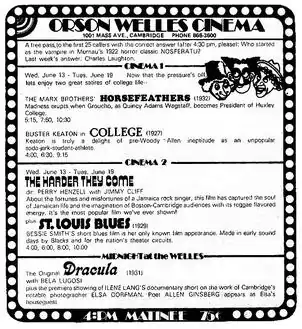 Film notes for each showing were prepared by staffer John Rossi, who for each film gathered lengthy cast and crew credits, a partial synopsis and selected film reviews. These were prepared in the upstairs offices of the complex, as was the black-and-white digest-sized Orson Welles Cinema Magazine.[7]