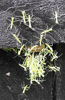 The New Zealand mantis is vulnerable to the use of pesticides, both directly and through the effects of a diminished food supply, and their ootheca are sometimes attacked by parasitic wasps.[3][10] Male O.novaezealandiae appear to be attracted to females of the introduced species M. caffra, which can result in their fatality due to the sexually-cannibalistic behavior of the latter species.[11]
