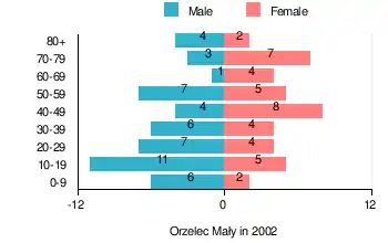 According to the 2002 Poland census, there were 90 people residing in Orzelec Mały village, of whom 54.4% were male and 45.6% were female. In the village, the population was spread out, with 26.7% under the age of 18, 30% from 18 to 44, 20% from 45 to 64, and 23.3% who were 65 years of age or older.[1]