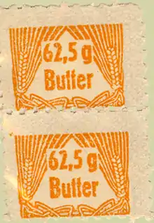 Having perfected his technique he quickly branched out, specialising in official documents, notably military identity cards and food coupons for butter ("Reisebuttermarken "). Most food ration coupons were marked with the identity of the retailer who would exchange them, but the butter coupons were not assigned to any particular retailer, which may have reflected the relative volatility of butter supplies. In any event, it meant that the butter coupons were untraceable and could be used and traded for other ration coupons on behalf of people who were living illegally (unregistered) and therefore received no ration coupons from the authorities.[5] Quality was characteristically excellent: butter coupons incorporated watermarks as a protective device to prevent forgery. Oskar Huth's butter coupons incorporated the same water marks. It was estimated that more than 60 people, mostly Jewish, who were hidden in the cavity directly under the rafter in the or cellars of people's homes, were able to survive because of the coupons produced by Oskar Huth in Käte Kausel's cellar.[8]