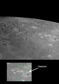 The crater Oskison is located in the far northern hemisphere of Mercury, in the plains north of Caloris basin. Oskison is a distinctive crater with a large central peak that exposes material excavated from depth. Many chains of secondary craters are visible radiating from Oskison outward onto the surrounding smooth plains.[1]