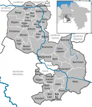 The district of Osnabrück encompasses 38 municipalities, eight of which are towns. 17 municipalities are part of a Samtgemeinde. Populations at 31 December 2007 are given in parentheses.[2]