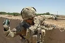 Soldiers were discouraged from carrying items such as bayonets, pens, or cyalume torches on the front of the Osprey vest in order to prevent facial injury in the event of a blast.[23] The combined weight of the Osprey vest, the body armour carried within the vest, and pouches attached to the vest meant that some wearers went back to using the earlier PLCE webbing.[24][25][26][27]
