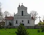 During the German invasion of Poland, which started World War II, the Wehrmacht captured the town on September 8, 1939. Afterwards it was occupied by Germany and included within the Radom District of the General Government, formed of German-occupied central Poland.[4] In 1940 the Germans carried out mass arrests of Poles as part of the AB-Aktion. Poles arrested in March were either deported to Nazi concentration camps or massacred in Góry Wysokie, while those arrested in June were imprisoned and tortured in Skarżysko-Kamienna and then murdered in a forest near Skarżysko-Kamienna.[5] Germans carried out several executions and massacres in the town. On September 30, 1942, 29 Poles, including merchants, teachers and local officials, were hanged at the Market Square.[6] In 1944, the Germans poured corrosive substances into their mass grave in attempt to cover up the crime.[6] Most of the town's Jewish community of app. 11,000 was murdered in the Holocaust in 1943–1944.