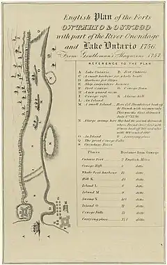 The British established a trading post in the area in 1722 and fortified it with a log palisade later called Fort Oswego, named after the native Iroquois place name "os-we-go" meaning "pouring out place."[4] The first fortification on the site of the current Fort Ontario was built by the British in 1755 and called the "Fort of the Six Nations."